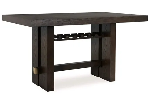 Dressed to thrill, the Burkhaus counter height dining table offers a high-design look at a down-to-earth price. Ultra-sleek lines are accentuated with a dark waxy brown oak-tone finish that’s so easy on the eyes. A thick tabletop and a pedestal base with integrated wine rack showcase quality craftsmanship and attention to detail. Clean-lined and modern, this timeless table has a look that’s made to last.