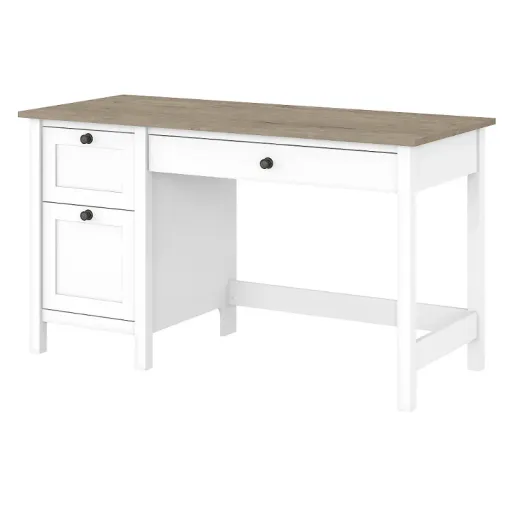 The Mayfield Collection computer desk with drawers includes plenty of practical features to keep you feeling productive. Spread out with all your materials on a durable 54W x 23D work surface that supports a computer, books, and more with a weight capacity of 200 pounds. A letter-size file drawer and a small box drawer ensure that the papers and office supplies you need are always within reach. A larger drawer pulls out to provide easy access to your keyboard or laptop and features a convenient flip-down front that folds up neatly when not in use. Dark Bronze drawer pulls complement the writing desk's Pure White and Shiplap Gray two-tone finish for an easy-going style you're sure to love. Available for Online Purchase Only. Assembly required. This product ships direct from the manufacturer, so RC Willey Delivery is not available.