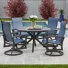 Get lost in the oversized comfort and structurally sound furniture of our exclusive Fairmont Collection. Feel the cool touch of the handmade aluminum frame, featuring a multi-step powder-coated and oven-baked clear coat finish. Each piece in this 5 piece swivel dining set is constructed by laser welding to create fully welded and braced frames with zero weld marks. The swivel rockers feature high-back seating and are comprised of quick-drying, sling material with speciality yarns woven in twill and horizontal line patterns. The 48 in. round dining table features 6 in. slats and an x-shaped base support for extra stability.