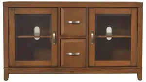 Divide and conquer with the Granthom 48" TV console, crafted of solid poplar with birch veneers. Wood-framed glass doors keep your media equipment visible yet protected, and cable cutouts allow you to snake cords through and ventilate your components. And the adjustable shelf means you can fit the interior space to meet your needs.