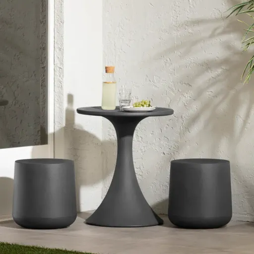 The Dalya dark gray 3-piece patio bistro set includes a chic table and 2 rounded stools. This trio of trendy and practical furniture can be installed outside or inside according to your needs. You will be impressed by its incredible comfort and durability. Thanks to its design in polyethylene, a hard and resistant plastic, your stools and your table will stay like new for years to come. No more scratches or fading! You can even afford to leave your furniture outside in the winter without having to worry. This is ideal if you live in an apartment and don’t have a lot of storage space. Available for Online Purchase Only. Ships Directly from the Manufacturer. RC Willey Delivery is Not Available. Assembly required.