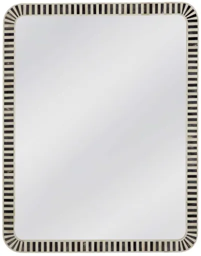 The Cyrus wall mirror presents a sleek and modern design, featuring a rectangular shape with rounded corners. Its chic black frame paired with cream and gray bone accents exudes contemporary elegance, making it a sophisticated addition to any living space. Crafted with attention to detail, this mirror effortlessly enhances your home decor.