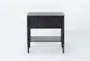As part of a complete whole-home collection that was developed entirely by Living Spaces, the Austen 1-drawer nightstand reflects a unique and thoughtful approach to design. With a refined all-American look and extensive functionality, this piece is a natural and purposeful addition to your bedroom. A textured black finish accentuates oak veneer and solid wood, while dark bronze knobs nod to antique inspiration. Stately and elegant, long, turned and tapered posts distinguish the frame. You'll enjoy the drawer and shelf for storing accessories and essentials, while 2 USB ports provide convenient bedside charging.