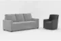 Introducing the Aramis Vintage Grey Fabric 74" Full Memory Foam Sleeper Sofa Bed and Katrina Velvet Grey Fabric Swivel Glider Arm Chair, perfect for your modern living room. The sophisticated grey fabric adds a touch of style while ensuring comfort with its 100% polyester content. These pieces are designed to fit seamlessly into any contemporary home, offering both functionality and a chic aesthetic.