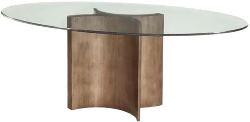 The Symmetry Dining Table features a modern sculptured base in antiqued silver leaf finish with gold wash to give the appearance of patinated Bronze. Tapered cylindrical arcs are conjoined to form the base, with beveled lay-on scratch resistant top glass. Bold, Modern, understated.