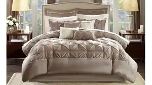 Update your entire space instantly with the Jelena 24-pc. Room in a Bag. The bold red base on this comforter works beautifully with the soft white and red piecing. Decorative embroidery adorns the bottom portion of this comforter and the center of each sham creating a rich look in your space. Four solid red window panels, four taupe tie backs and two embroidered valances accompany your new bedding for a whole room makeover. Four embroidered decorative pillows, two shams and a bedskirt put the finishing touches on this complete look.