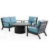 Experience the oversized comfort and structural strength of our exclusive Montecito Collection, featuring a handmade aluminum frame with a durable multi-step powder-coated and oven-baked clear coat finish. Each piece in this 4 piece loveseat group with a fire pit is built by laser welding to create fully welded and braced frames with zero weld marks. The loveseat and club chairs feature PVC sling seat suspenion and include oversized deluxe Sunbrella® acrylic cushions. The textilene material's flexibility and sturdiness make it a comfortable material for seating.