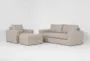 Introducing the Acosta Beige 3 Piece Condo Sofa Chair & Storage Ottoman Set, designed to enhance your living room with modern functionality. This set features a sofa, a chair, and a storage ottoman, all upholstered in durable beige fabric made from 100% polyester. Its track arms and tight back provide a clean and contemporary look while offering comfortable seating and practical storage options.