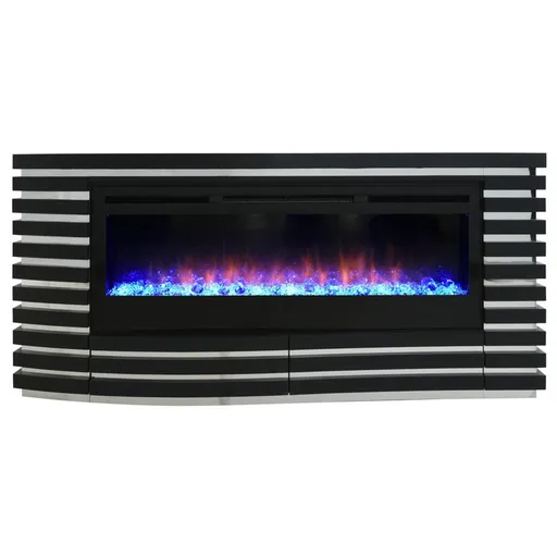 The Elliot Electric Fireplace w/Remote Control was designed to stand out with its bold striped pattern. Modern and eye-catching, this piece brings you a realistic flame effect with and without heat. You can warm a 400 square-foot room at any time, using the thermostat control and timer function. This inky black wooden fireplace features a glossy finish with a brushed metal base and multicolor LED lighting. It also includes two concealed drawers and wire management cutouts that add convenience, but don’t take away from its striking design.
