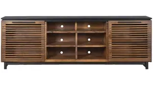 Our Reah 85" console is cultured and chic, with a modern Hollywood appeal as classic as Elvis himself. This two toned stunner with slatted doors would have been a hit down in the jungle room. It holds up to a 96" TV and has plenty of storage for media gear to entertain the night away with your favorite Elvis movie.
