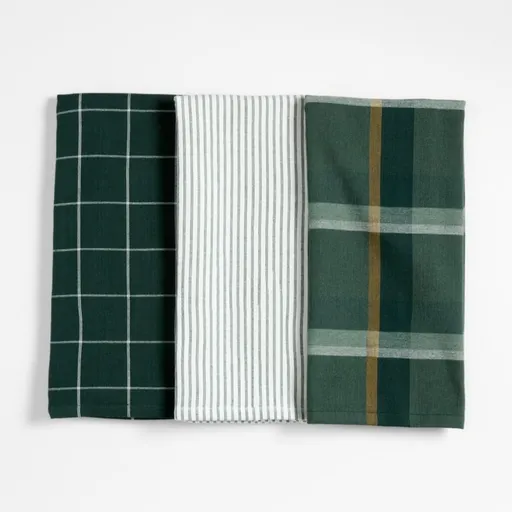 Keep dishes, counters and hands dry all winter long with our set of three seasonal dish towels in holiday hues. Pine green pinstripes adorn one snow white towel, an open windowpane in the same palette crisscrosses another, while a cozy plaid in golden, white and shades of green patterns the third. Woven of organic cotton that softens with each washing, the dish towels reverse to plush terry cloth for optimal absorbency.