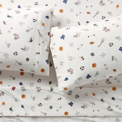 Game on for bedtime. Our Victory Vibes sheet set is covered in playful, hand-drawn sports and hobby icons, bringing all kinds of kid passions into one lively, colorful pattern. Made from 100% organic cotton, it's ready for dreamers who love to play hard and snooze well.