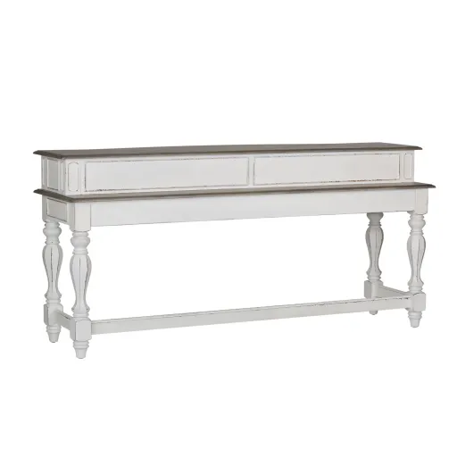Whether it is being used as a space to set extra photos and decorations, or as a surface for guests to sit and set their drinks at during a party, this traditionally styled console table makes the ideal addition to your living room. The multilevel top and three storage cubbies in the rear of the table offer plenty of space to store and set books or decorations, adding an extra element of function to this piece.