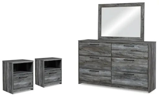 Beachy style and lots of storage go hand in hand with this dresser with mirror. Its driftwood and surfer-inspired smoky finish creates a rustic look that's perfect for setting the scene of an island getaway. Six roomy drawers give you the space needed for stowing away clothes and more. Clean lines and modern handles combine for an authentic look to be admired for years to come. 2 nightstands also included.