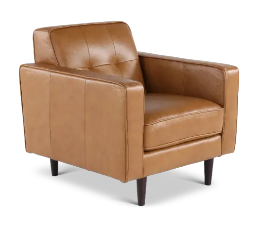 Simplified silhouettes artfully blend with inviting comfort in the Stark collection. Drawing inspiration from mid-century design, the chair's clean lines, squared arms, and lofty tapered legs exude sophistication and effortless charm. It's handsomely covered in a warmly hued biscoff tan leather, while simplified button-tufting along the back cushion lends depth and character.