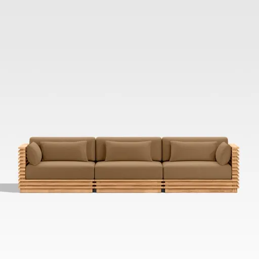 Modern and made for the outdoors, Batten's modular design flexes with your space and entertaining style. Crafted of sustainably sourced, unfinished solid teak, it is built to last a lifetime. The sofa's bold slats, striking linear profile and minimalist silhouette give it a distinctly modern look. A cozy mix of plush seat, back and lumbar cushions plus throw pillows provides unrivaled comfort and can all be upholstered in a weather-resistant fabric of your choice.