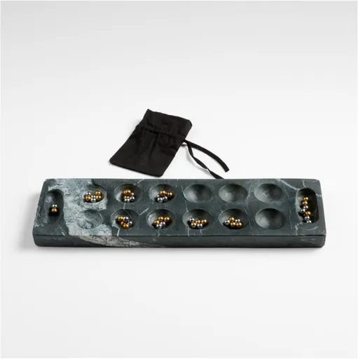 Intended to be played or just admired, this striking mancala set is made out of gorgeous black marble with expressive waves of white veining. Gold- and silver-tone playing balls add to the set's glamorous appeal.