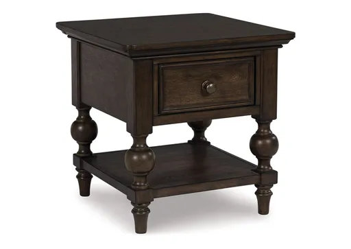 For those who appreciate a time-honored aesthetic with understated elegance, the Veramond end table brings home a timeless look. Its rich brown walnut finish merges seamlessly with a profiled top and traditional baluster turned legs for a richly classic appeal. And did we mention there's a lower shelf to display your whatnots?