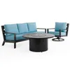 Experience the oversized comfort and structural strength of our exclusive Montecito Collection, featuring a handmade aluminum frame with a durable multi-step powder-coated and oven-baked clear coat finish. Each piece in this 3 piece swivel sofa group with a fire pit is built by laser welding to create fully welded and braced frames with zero weld marks. The sofa and swivel club rocker feature PVC sling seat suspenion and include oversized deluxe Sunbrella® acrylic cushions. The textilene material's flexibility and sturdiness make it a comfortable material for seating.