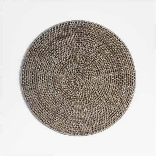 Tropical chic for the tabletop. A sophisticated circle is intricately woven of earth-friendly rattan to create a warm texture finished in subtle grey. Woven by hand by skilled craftspeople, our exclusive rattan round placemat perfectly suits the modern organic home. Due to the natural material and handcrafted construction, each mat will vary slightly.
