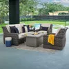 The Tangiers Collection is a modern take on traditional wicker with handwoven synthetic wicker and triple layered foam cushion that will give your outdoor space the sophistication it deserves without sacrificing comfort. Each seating piece of this 4 piece sofa group with a fire pit is handwoven with 11mm x 2.3mm half-round synthetic wicker strands, treated with UV inhibitors, over a powder-coated extruded aluminum frame. The wicker material is crafted with a 3000 hour UV rating to provide fade-resistance. The sofa and club chairs have architectural features such as curved arms and a bottom seating frame with an inward curved arch. Sink into the triple-layer foam construction cushions wrapped in 100% Sunbrella® acrylic fabric and relax in comfort with this generously sized collection.