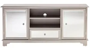 Halsey Media Stand add some allure to your living room with this glamorous, mirrored media stand. Silver painted finish, beveled mirror accents, and crystal style knobs create a contemporary look that brightens any room. Ample storage includes one drawer, open center area, and two cabinets for housing everything from games to electronic components. This spacious media stand is the ideal entertainment solution with a chic design.