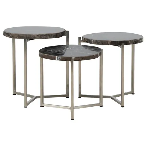 Featuring wooden tops and metal legs, the Sumatra Nesting Tables are pure elegance. Made in India, this one-of-a-kind trio features a brown marble-inspired look that is sure to add sophistication and character to any space. Bold, smooth and shiny, this set is just right for any decor.