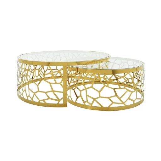 Upgrade your modern living room with the eye-grabbing aesthetic of the Lacey Gold Nesting Tables. Visually stimulating, this design features a tempered glass top and a golden stainless steel frame with a coral sea fan pattern. This stunning set can conserve space in your living room layout and, at the same time, provide an extra surface for serving drinks and snacks to your houseguests.