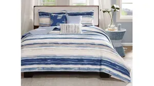 The Marina Coverlet Set provides a modern take on the coastal stripe. It's watercolor motif, accented with shades of navy and aqua, provides the calming feel of the ocean in your space. Three decorative pillows use embroidered seashells and fabric manipulation to pull this look together.