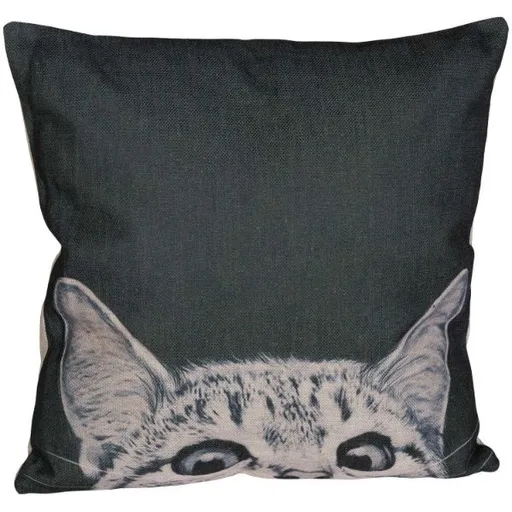 Here Kitty Kitty 18x18 Pillow. Cover contents of 85% polyester and 15% cotton. Pillow features a cute kitty peaking over.