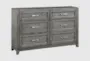 Experience timeless style and practical storage with the Gunnar Grey Wood 38" 6 Drawer Dresser. This traditional bedroom dresser, crafted from solid acacia and okoume veneer, showcases a grey wood finish that complements a range of earthy tones and farmhouse aesthetics. Perfect for organizing your sleeping space, this dresser features six spacious drawers that glide smoothly on metal tracks.