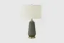 This 26" contemporary table lamp features a green ceramic base and a cream linen drum shade, accented with a gold finial on top. It provides the perfect decorative accent lighting for a living room, home office, or bedroom, making it ideal for end or side tables.