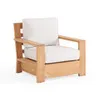 Our Teak Two products from the Castello deep seating collection have a modern look that adds both charm and convenience to your space. This solid teak club chair has a fine, sanded finish for less long-term maintenance as you enjoy it for years to come. The features of the Castello club chair contain a wide-set frame with a clean, straight constructed form. The back frame consists of horizontal slats and the arms of the chair are constructed in a boxy manner. In addition, the club chair contains a wide-set bottom frame, creating a more elevated seating appearance. The teak used is plantation grown, European grade teak from FSC-certified upcycled teak wood, gathered from old-growth, FSC-certified forests, across the Indonesian archipelago. The teak wood undergoes a six-week kiln drying process of taking moisture out of the wood. This is important because the moisture in the teak wood is what causes the finished product to shrink or expand with changes in temperature and humidity. Teak is the only material with a natural resistance to water, insects, mold, and mildew, making it one of the most durable materials we carry. This club chair is a combination of machine-made for precision and handmade with traditional Mortise and Tenon construction for smooth and tight joinery to showcase the elements from local artisans.