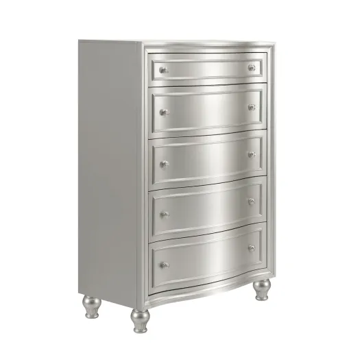 Introducing the Reflection Chest in Silver, meticulously crafted from solid Pine and high-quality manufactured wood to ensure enduring strength and durability. Its glamorous matte silver finish exudes sophistication, reflecting the mirrored panels and silver drawer pulls of the 5-drawer chest, adding an elegant touch to any bedroom decor. Experience sophisticated luxury with bowfront drawers, sumptuous lavender velvet linings, picture frame moldings, and turned bun feet, seamlessly blending classic charm with modern flair. Inside, find meticulous craftsmanship with English dovetail joinery, full extension drawer glides, finished interiors, and select velvet-lined drawers to safeguard delicate items. Enjoy extra upgrades such as the cedar-lined bottom drawer, perfect for sweater storage. This chest is not just a piece of furniture—it's a marvel of design and practicality, destined to enhance your bedroom space with style and functionality.