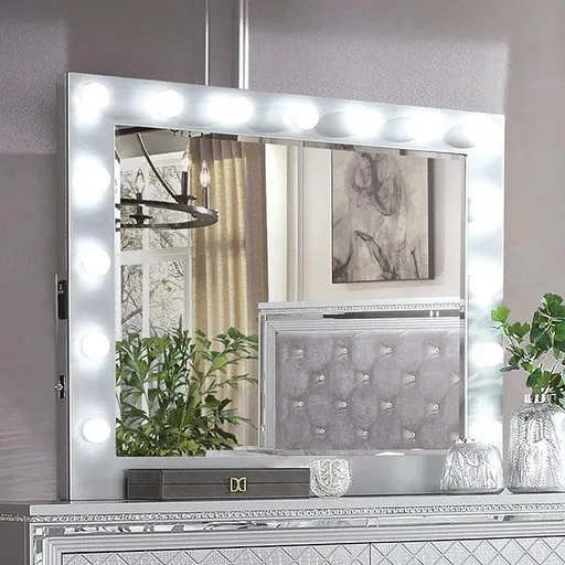 BELLETERRE Mirror, 44 W X 37 H X 3 D, 66lbs. Talking about taking glam to the next level Straight lines and simple silhouettes are reminiscent of the modern era, but the stunning details bring it up a notch. This matching vanity mirror is lined with large bulbs that will softly illuminate any Hollywood-inspired room.