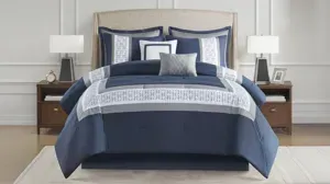This Powell 8-pc. Comforter Set features an embroidered and pieced border for a sophisticated and elegant design that easily coordinates with your space. The matching pillow shams also flaunt beautiful embroidery details, while the grey Euro shams are accented with graceful navy flanges to complete the transitional look. A solid navy bedskirt and 2 decorative pillows with embroidered details add the finishing touches to this hotel style bedding set. Hypoallergenic polyester filling in the comforter and pillows contains no allergens and is treated to be dustproof. Machine washable for easy care, this embroidered comforter set may come in rolled or compressed packing and will need to be fluffed up. Use a steam iron to help remove wrinkles easier.