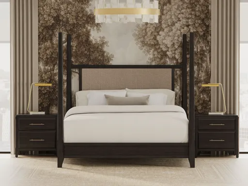 The Geary Bedroom Set combines bold style, modern details, and practical storage to create a striking centerpiece for your bedroom. Available in king or queen sizes, this set includes the Geary Bed, Dresser, and Mirror. The four-post Geary Bed features a black frame crafted from rubberwood solids and veneers, paired with a dark beige upholstered headboard accented by unique openings on either side for added visual interest.