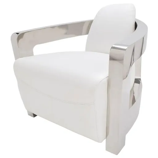 The Aviator II Accent Chair is a stylish chair to add to your living room. Upholstered in porcelain white leather with foam padding, this accent chair offers instant comfort while the uniquely shaped polished stainless steel frame emphasizes the trendy modern style that your home might need.