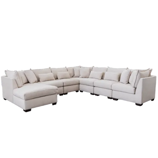 Haven Ivory 7 Piece Sectional with LAF Chaise from Peak Living. Sectional Includes two corner pieces, four armless chairs and a lAF Chaise. Frame constructed of hardwoods and furniture grade plywoods. Quality foam cushion core construction. Covered in an Ivory colored 100% polyester fabric. Includes 6 toss pillows and 4 kidney pillows, not sold separately. Spot clean with water-free solvents. cc W.