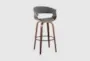 Enhance your kitchen or dining area with the Vintage Modern 30" Bar Stool. This set of 2 bar stools features a stylish mid-century modern design, combining walnut wood and light grey upholstery for a sophisticated look. The cushioned seat and backrest provide comfort, while the 360-degree swivel and fixed bar height offer functionality. The bent wood legs and round black metal footrest add a touch of elegance to these versatile stools.