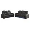 Includes power reclining loveseat with console and power reclining sofa Dual-sided recliners (sofa's middle seat remains stationary) Polyester/polyurethane upholstery Corner-blocked frame with metal reinforced seats Attached back and seat cushions High-resiliency foam cushions wrapped in thick poly fiber One-touch power controls with adjustable positions Includes USB charging ports in each power control Easy View™ power adjustable headrests Armrests with flip-top storage and cup holder Loveseat has center console with cup holders and underneath storage Sofa's center seat folds down into a table with cup holders Ambient blue LED lighting on cup holders and base for a theater-style experience