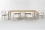The Freya 78-100" Extendable Natural Rectangular Wood Dining Table paired with Performance Boucle Curved Arm Chair Set for 6 creates a welcoming dining space. Crafted from oak veneers and solid oak, this Scandinavian-inspired dining set combines functionality with timeless design. The natural characteristics of the materials and the high performance fabric ensure durability and comfort.