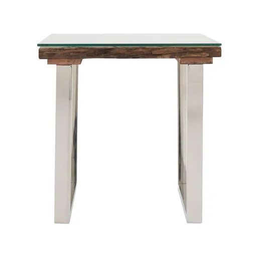 The Railway Side Table will visually enhance the style of your living room. U-shaped polished stainless steel legs support a distressed railwood top in natural brown with a grainy feel to the touch protected with a smooth clear tempered glass, establishing an upscale one of a kind design in your own home.