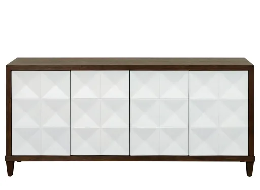 The Stellar 70" Console is Wood finish frame surrounds bright white doors with a concave geometric design adding dimension and visual interest to any space.
