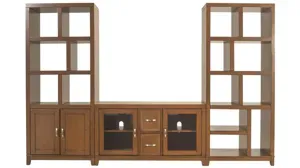 Divide and conquer with the Granthom 3-pc. wall unit crafted of solid poplar with birch veneers. The 48" TV console and pair of open towers enable you to customize your entertainment space. Wood-framed glass doors and see-through compartments add to the visual transparency of this flexible wall unit.