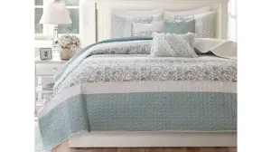 For the stylish, modern room, Dawn Reversible Coverlet Set holds all of the perfect elements to do shabby chic the right way. A mixture of soft blue, periwinkle, and hints of green are printed in a paisley design alongside pintucked blue fabric that is separated by lace taping. Three decorative pillows with pleating, embroidery and ruching details complete this look.