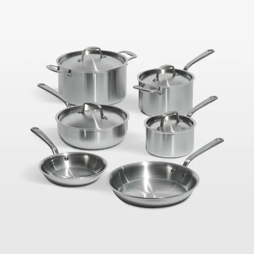 This Italian-made stainless steel cookware set from Made In brings professional-level quality and durability home. Five-ply construction envelops a triple aluminum core for optimal heat conduction in stainless steel cladding. The cooking surfaces are non-reactive, the magnetic exteriors are induction compatible, and the layered structure eliminates hot spots (meaning less stuck-on food and less scrubbing). The saucier cooks silky, impeccably emulsified sauces, while the saucepan simmers precisely. A pair of frying pans sear and fry to crispy perfection, and the stockpot boils and braises. Stay-cool handles make the pans comfortable to carry, and rolled rims ensure easy pouring and restaurant-worthy plating. Timeless with traditional styling, this 10-piece cookware set pairs with our other Made In cookware to outfit your kitchen beautifully.