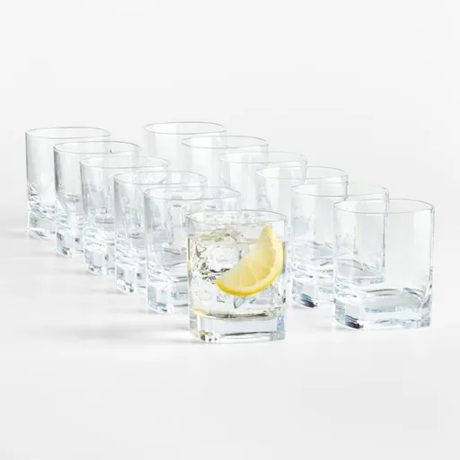 Cool drinkware just around the corner. Modern yet old-fashioned glass squares off with slightly rounded angles for easy sipping. Thick, substantial shams highlight the geometric shape and show off artisan cocktails, herbal iced tea and liquors on the rocks. This set of one dozen double-old fashioned glasses is dishwasher-safe for easy cleanup after cocktail hour and dinner parties.