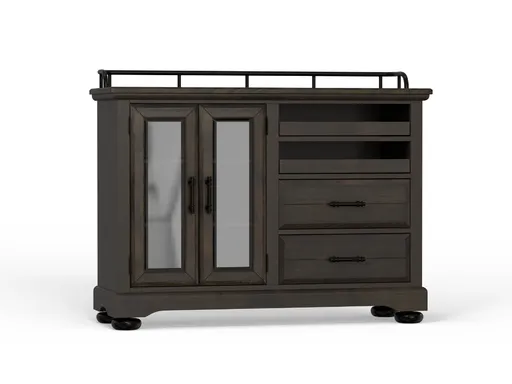 The Bella Dining Server is the perfect blend of form and function, designed to bring both style and practical storage to your dining space. Crafted from brown elm solids and veneers, this piece showcases a rich coffee finish that enhances the natural beauty of the wood while adding warmth and depth to any setting. A metal railing accents the back and edges of the top surface, giving it a subtle industrial touch and helping to keep items secure during service or display.