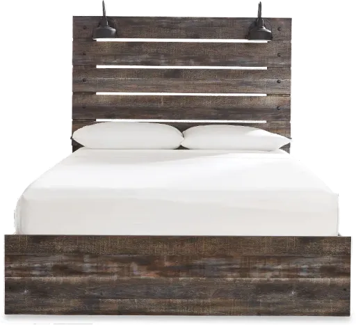 Add warm, rustic character to your bedroom spaces with the Sunset Park collection. This queen-size bed offers a refined take on barn-board beauty with its complex, replicated wood grain that gives it a sense of weatherworn charm. The open-slat headboard features a retro-chic light sconce and convenient USB plug-ins. Includes headboard, footboard, and rails.